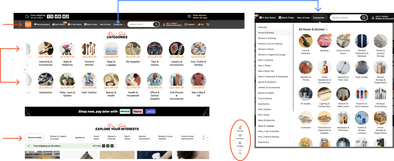 I’ve saved the scariest for last. Temu is quite possibly the best example of the worst navigation. There’s about 17 million things going on at once, and their homepage is flooded with click-throughs, autoplaying carousels, and vague CTAs. Worst of all? They’ve buried their actual shopping categories under infinite nested buttons with jarring hover states. For the love of all that is good in this world, please use this as a cautionary tale.